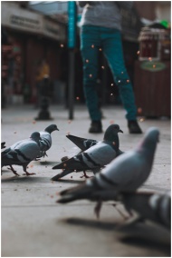 A group of pigeons on city pavement with blurred h