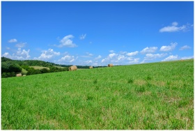 Tranquil rural scene with hay bales on a vibrant green field under a blue sky.