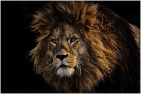Close-up portrait of a majestic lion with a dark b