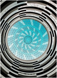 Low angle view of a circular glass dome ceiling featuring geometric patterns.