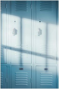 A row of bright blue school lockers illuminated by natural sunlight, casting shadows.