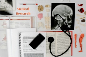 Flat lay of medical research materials with a stethoscope and anatomical models.