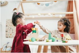 Two young girls enjoying playtime with wooden toys indoors in a warm, colorful playroom.