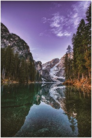 Breathtaking mountain landscape with serene lake reflection during dawn, showcasing nature's tranquility.