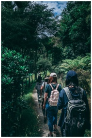 Women hiking along a scenic forest trail, enjoying