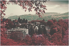 Charming autumn view of Bern, Switzerland, with vivid foliage and picturesque houses.