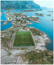 A breathtaking aerial view of a soccer field in Lofoten Islands, Vågan, Norway surrounded by stunning seascape and mountains.