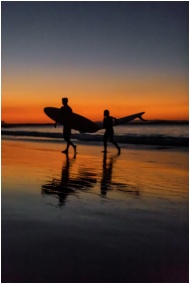 Silhouetted surfers walking on Noosa Heads beach during a vivid sunset.