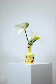 Stylish anthurium flowers in a colorful vase on a