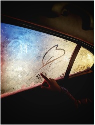 A hand draws a heart on a steamy car window with colorful light reflections.