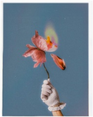 Dramatic depiction of a pink flower on fire held by a gloved hand against a blue background. Conceptual and artistic.