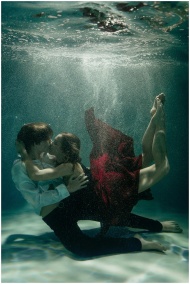 Artistic underwater photo of a couple embracing in red and white attire, conveying love and passion.