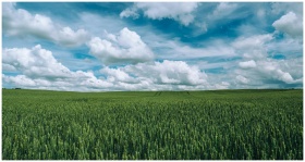 Expansive green wheat field under bright blue sky with clouds in rural Poland, capturing nature's serenity.