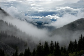 Tranquil misty mountain landscape with coniferous trees in Ridgway, Colorado.