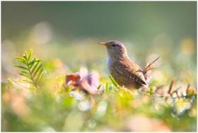 A close-up of a wren perched on the ground amidst lush foliage, with vibrant colors and blurred background.