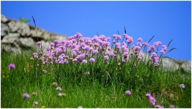 Beautiful pink flowers blooming in a lush green field against a clear blue sky.