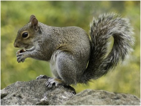 Gray squirrel perched on a rock enjoying a nut. Ca