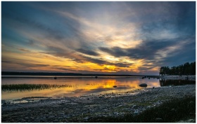 A breathtaking sunset over a calm lake, reflecting vibrant sky colors, creating a tranquil atmosphere.