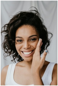 A cheerful woman with curly hair and a radiant smi
