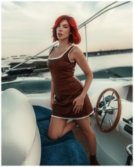 Stylish woman with red hair posing confidently on a yacht in Dubai's Marina.