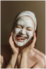 Happy woman with a clay mask, smiling and enjoying