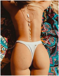 A woman enjoys the beach, showcasing shells on her back in Florianópolis, Brazil.