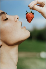 Close-up of a woman about to eat a fresh strawberry in a sunny outdoor setting.