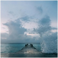 A tranquil view of an ocean pier with waves splashing at sunrise, capturing nature's beauty.