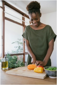 Smiling woman in kitchen slicing bell peppers, promoting healthy eating and joy in food preparation.