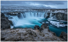 Majestic Godafoss waterfall captured in winter, showcasing icy landscape and stunning blue waters.