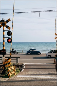 Coastal road scene in Kamakura, Japan with cars an