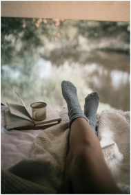 Woman relaxing with socks, book, and coffee by win