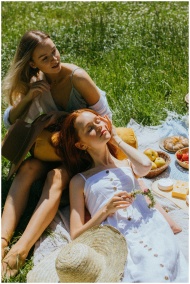 Two women enjoying a sunny picnic outdoors with fresh food and a relaxing atmosphere.