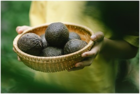 Crop faceless female holding wicker bowl full of avocado while standing in garden