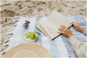 Beachside picnic scene with book, green grapes, an