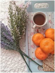 Freshly brewed coffee accompanied by vibrant oranges and lavender on a tray