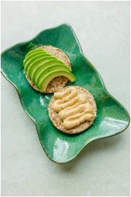 Sliced avocado and hummus on rice cakes served on a ceramic plate for a nutritious snack.