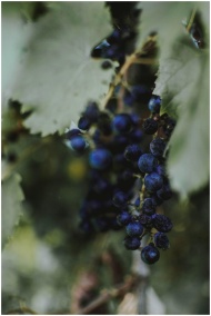 Clusters of deep purple wine grapes hanging on the vine surrounded by lush foliage.