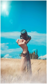 A hand raises a camera amidst a sunny field, evoki