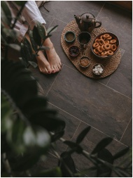 High angle view of a cozy tea setting with donuts on woven mat and decorative plants.