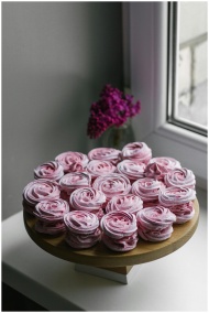 High angle of delicious zephyr type of soft confectionery made by whipping fruit and berry puree placed on windowsill near blooming flowers