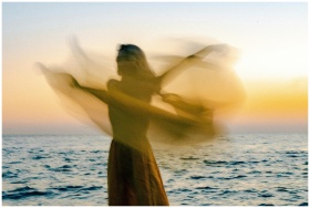 Ethereal silhouette of a woman dancing by the sea