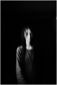Haunting blurred portrait of a woman on a dark background, creating a ghostly effect.