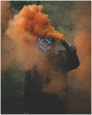 A person wearing an LED mask holds a smoke bomb, e
