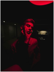 A dramatic portrait in red lighting capturing an e