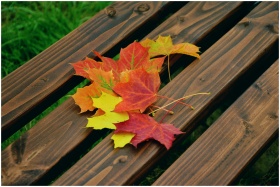Bright autumn leaves scattered on a wooden bench,
