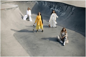 Stylish women in trendy outfits posing with skateboards in an urban skate park.