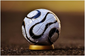 Macro shot of a soccer-themed puzzle ball on a sta