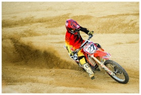 Motocross rider carving through the dirt track wit