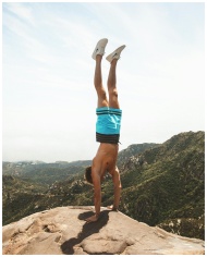 A fit man doing a handstand on a mountain peak with scenic views.